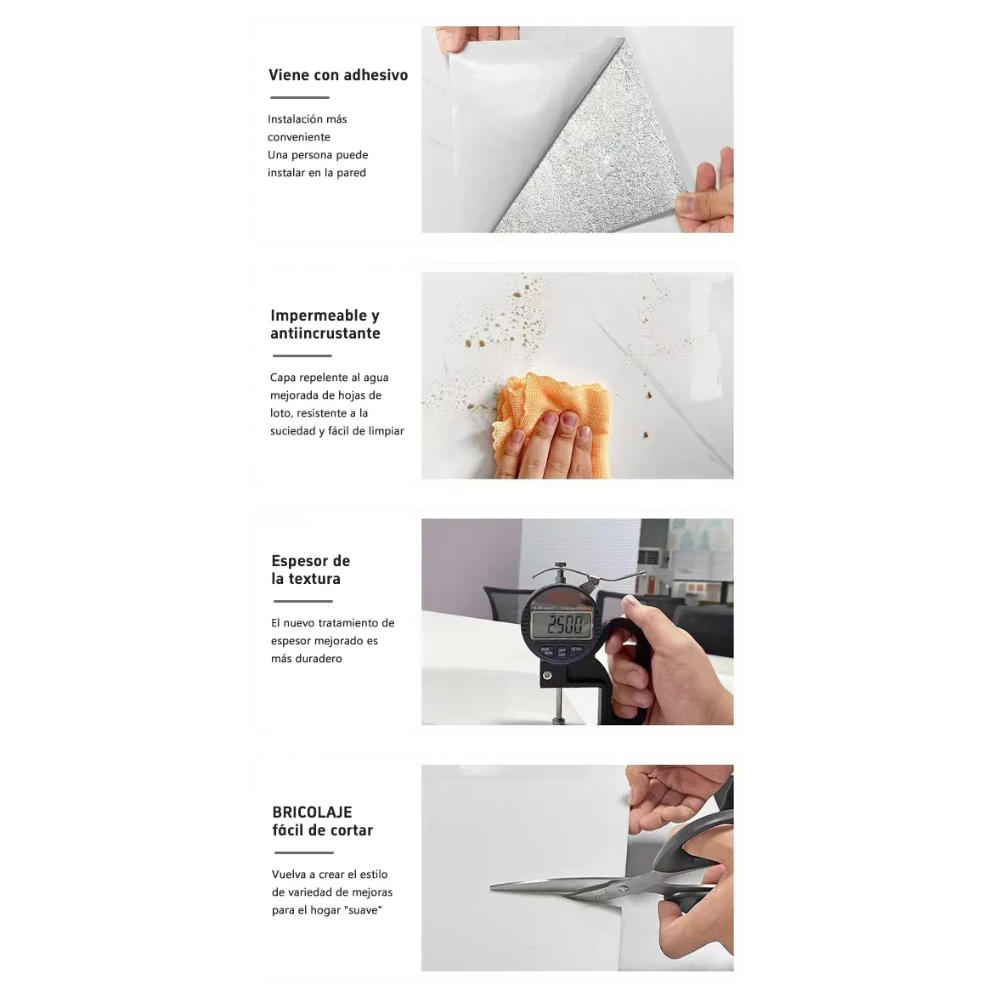 Oculta imperfecciones de forma sencilla sin necesidad de instalación profesional. Es una solución rentable para renovar propiedades en alquiler, casas antiguas o nuevas construcciones sin realizar obras complicadas.