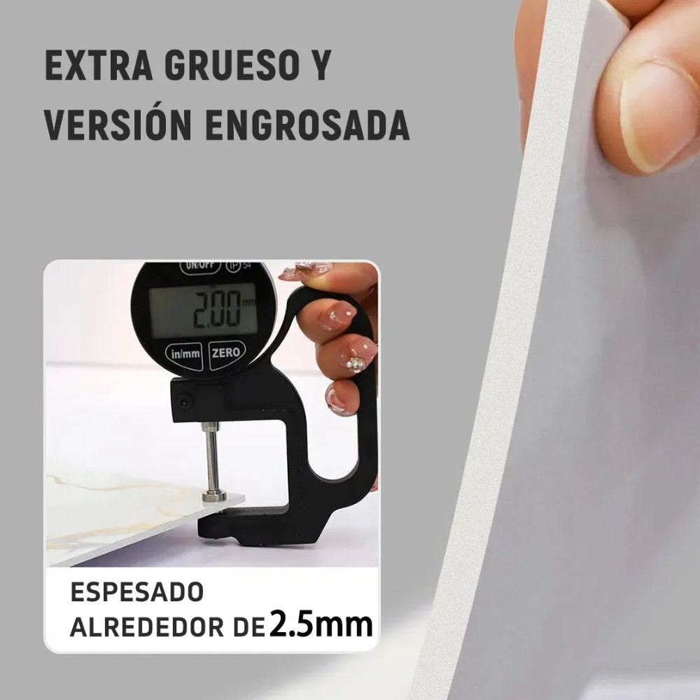 Fabricado con una capa superficial de PET y base adhesiva con respaldo de lámina, este revestimiento ofrece un grosor mejorado que garantiza mayor resistencia y larga vida útil. Su elegante acabado efecto mármol con textura fina aporta un toque moderno y sofisticado a cualquier espacio.